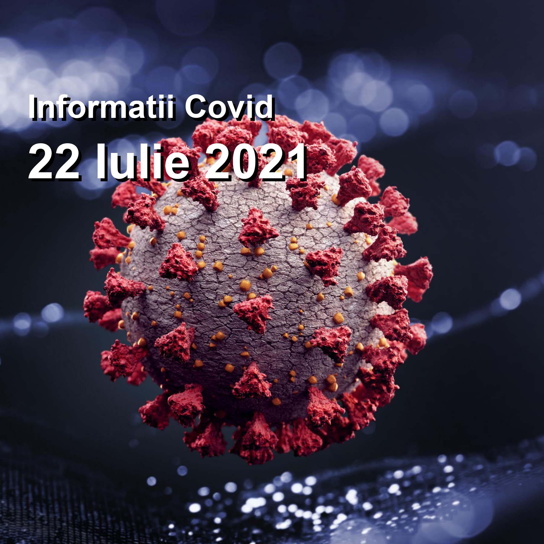 Bilanţ COVID-19 din 22 iulie 2021. 24663 de pacienți au fost declarați vindecați și 2693 de pacienți asimptomatici au fost externați la 10 zile după depistare. București 165.